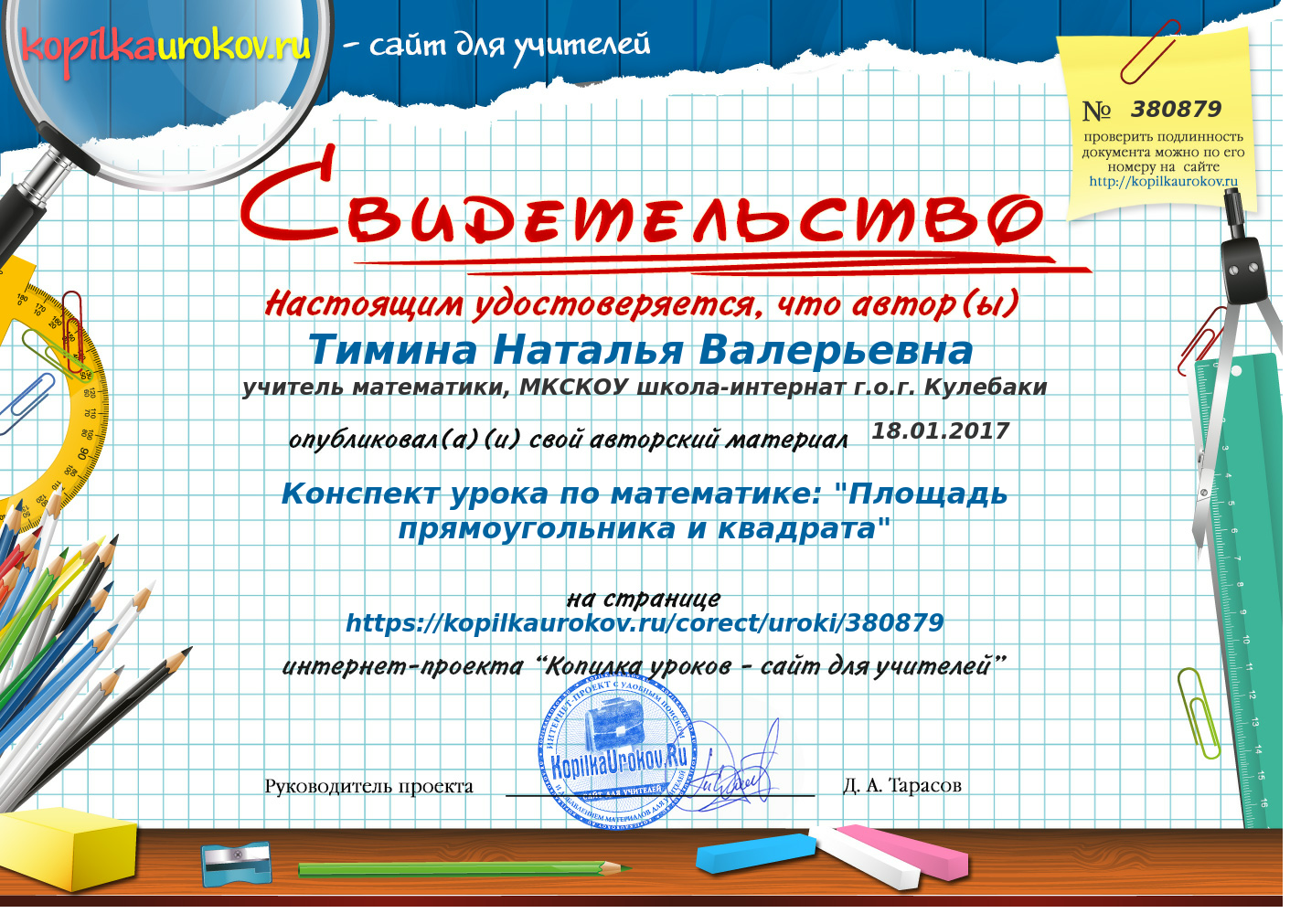 - Свидетельство о публикации конспекта урока по математике «Площадь прямоугольника и квадрата» https://kopilkaurokov.ru/matematika