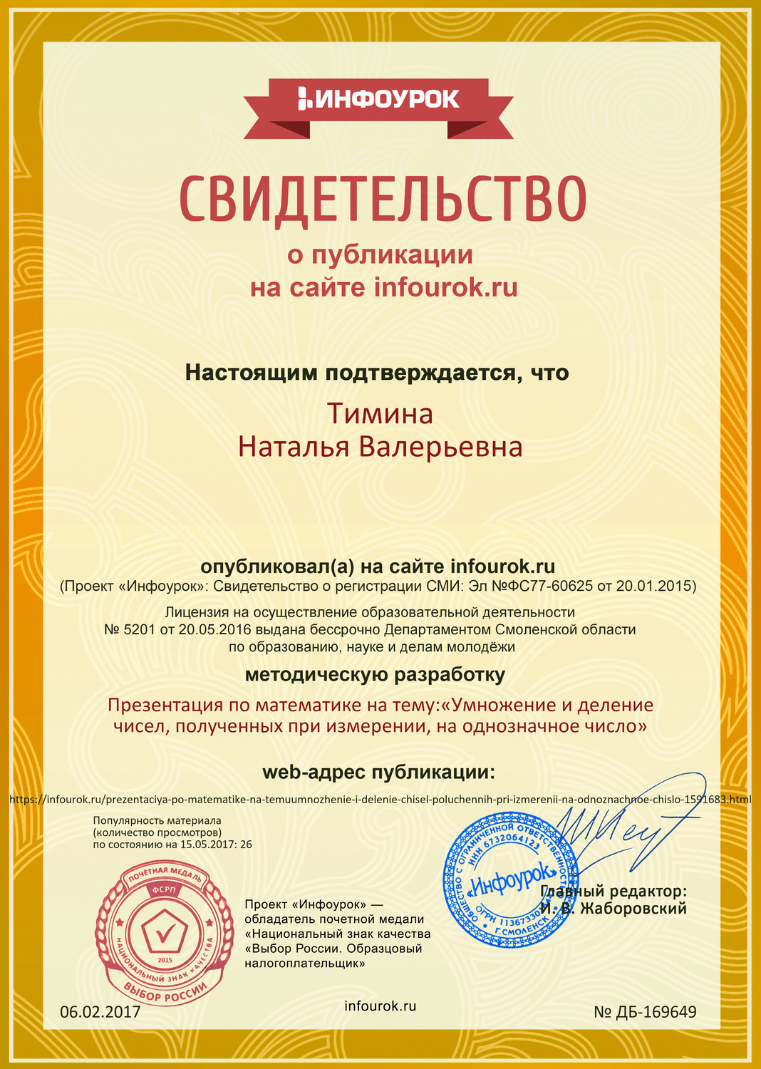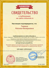 - Свидетельство о публикации методической разработки урока по математике на тему «Умножение и деление чисел, полученных при измерении, на однозначное число» https://infourok.ru/user/timina-natalya-valerevna/material