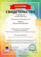 - Свидетельство о публикации методической разработки по математике на тему «Турник знатоков математики» (олимпиада для обучающихся 7 класса коррекционных школ). https://infourok.ru/user/timina-natalya-valerevna/material