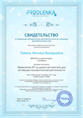 - Свидетельство о публикации методической разработки по математике на тему «Турник знатоков математики» (олимпиада для обучающихся 8 класса) коррекционных школ. https://infourok.ru/user/timina-natalya-valerevna/material