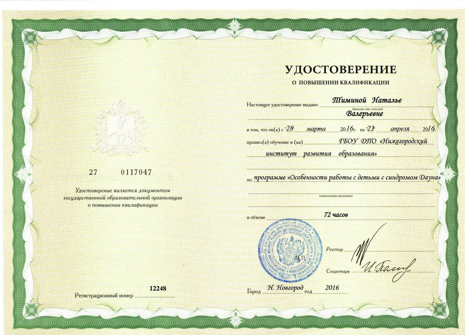Курсы повышения квалификации "Особенности работы с детьми с синдромом Дауна" 72 ч., 2016 г.