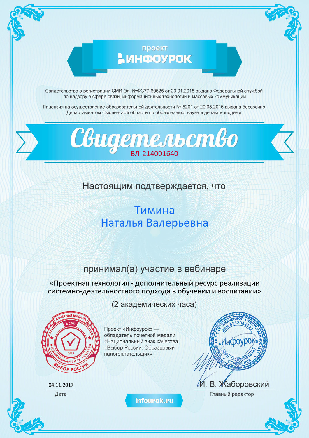 Вебинар "Проектная технология - дополнительный ресурс реализации системно - деятельностного подхода в обучении и воспитании" 2ч. 2017 г.