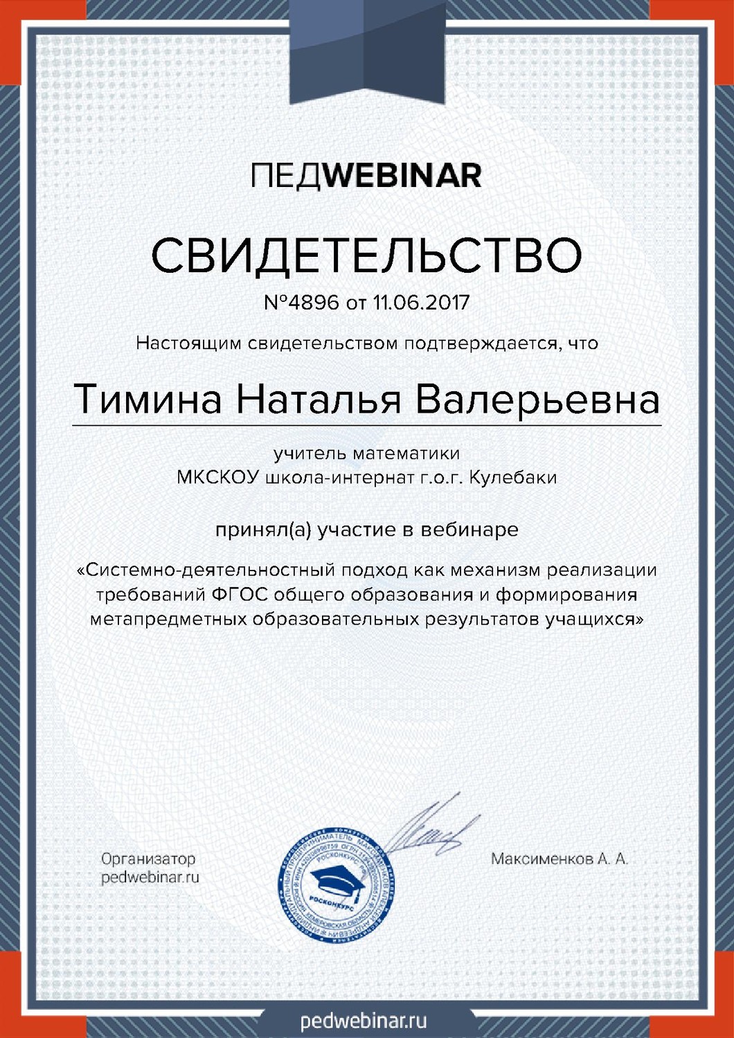 Вебинар "Системно-деятельностный подход как механизм реализации требований ФГОС общего образования и формирования метапредметных образовательных результатов учащихся"