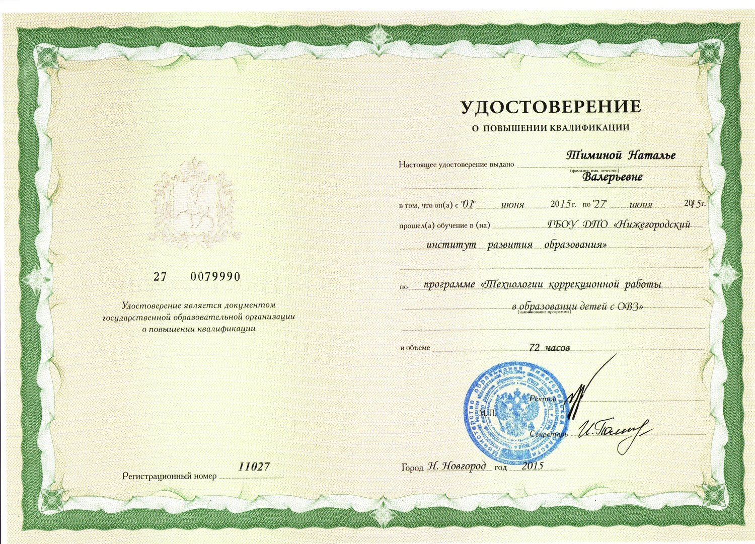 Курсы повышения квалификации "Технологии коррекционной работы в образовании детей с ОВЗ" 72 ч., 2015 г.