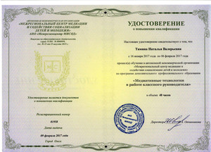 Курсы повышения квалификации "Медиативные технологии в работе классного руководителя" 48 ч., 2017 г.
