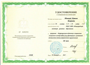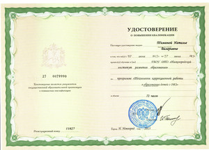 Курсы повышения квалификации "Коррекционная педагогика и специальная психология в аспекте ФГОС для обучающихся с умственной отсталостью (интеллектуальными нарушениями)" 108 ч., 2017г.